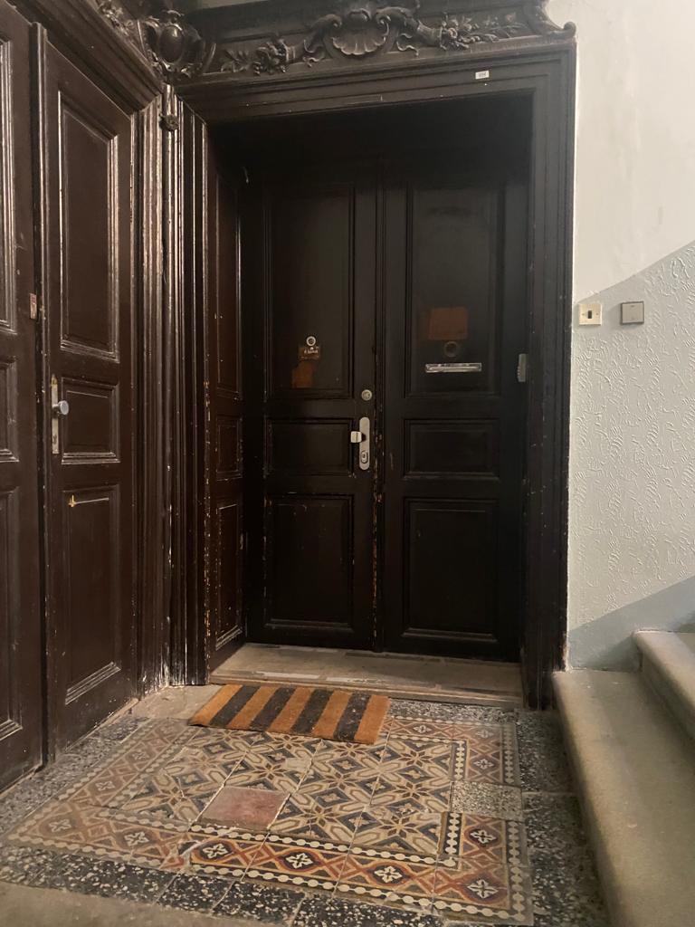 Take 6 or so steps up and the first brown door ahead is the common entry to my 4 apartments. Use the biggest key to unlock.