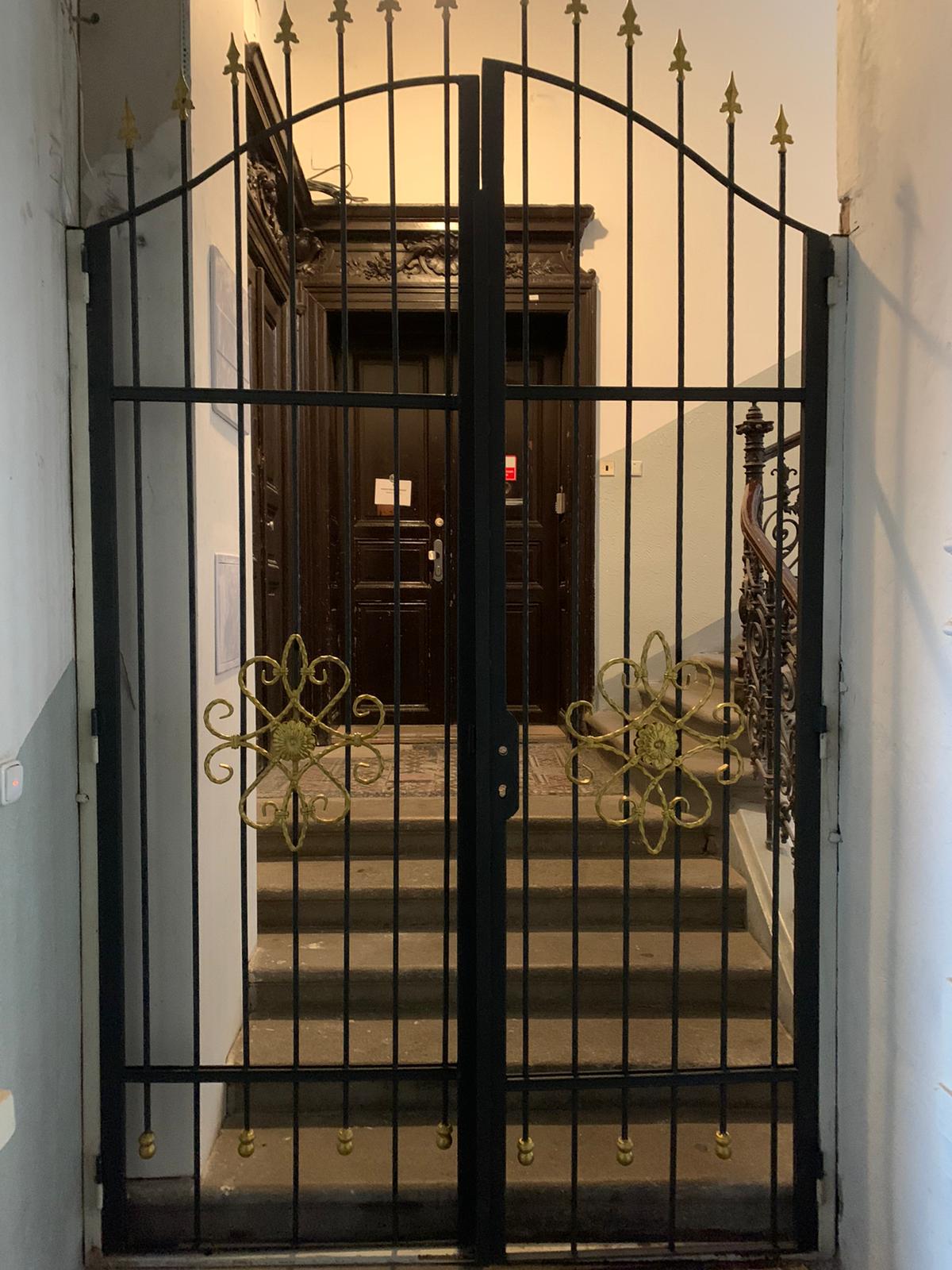 One of the middle size keys fits there. ALSO.. each next time you come back to the apartment from the square using the code, this code buzzes ( unlocks not just the square doors but also this iron gate. So you can use it for more convenient keyless entry