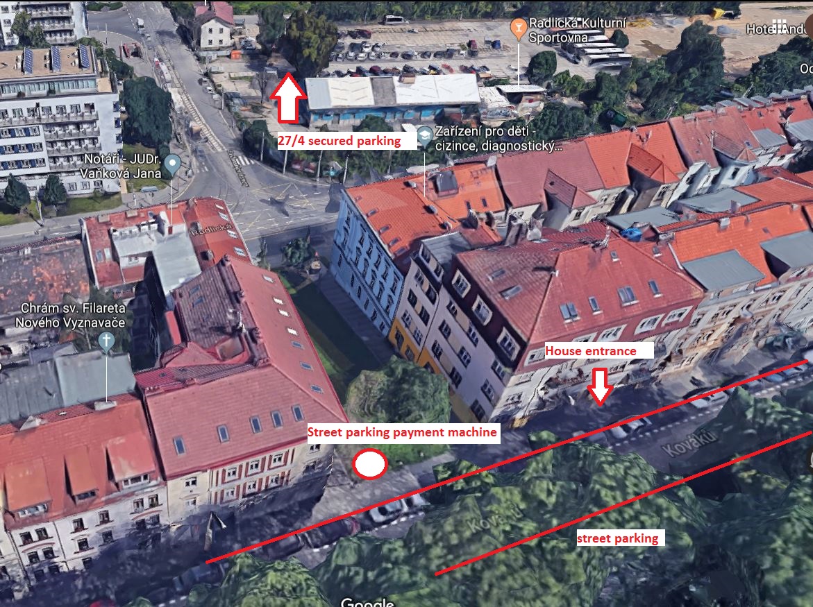 Closest secured parking space is in front of ,Na Knizeci, station, 2 minutes walk from the studios. Price is approx. 28 Euro per day.