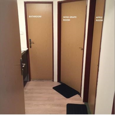 Вы находитесь в общем пространстве для комнат Wine и Apple. Ваша комната первая справа. В вашем распоряжении личная спальня и общая кухня и ванная комнату, которая также доступна для гостей комнаты Wine.
