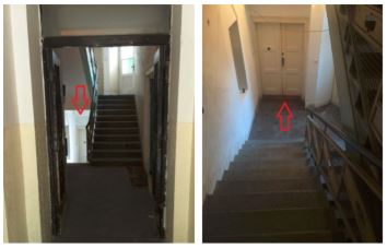 Lorsque vous rentrez dans la bâtiment, prenez les 3 marches pour accéder aux escaliers.