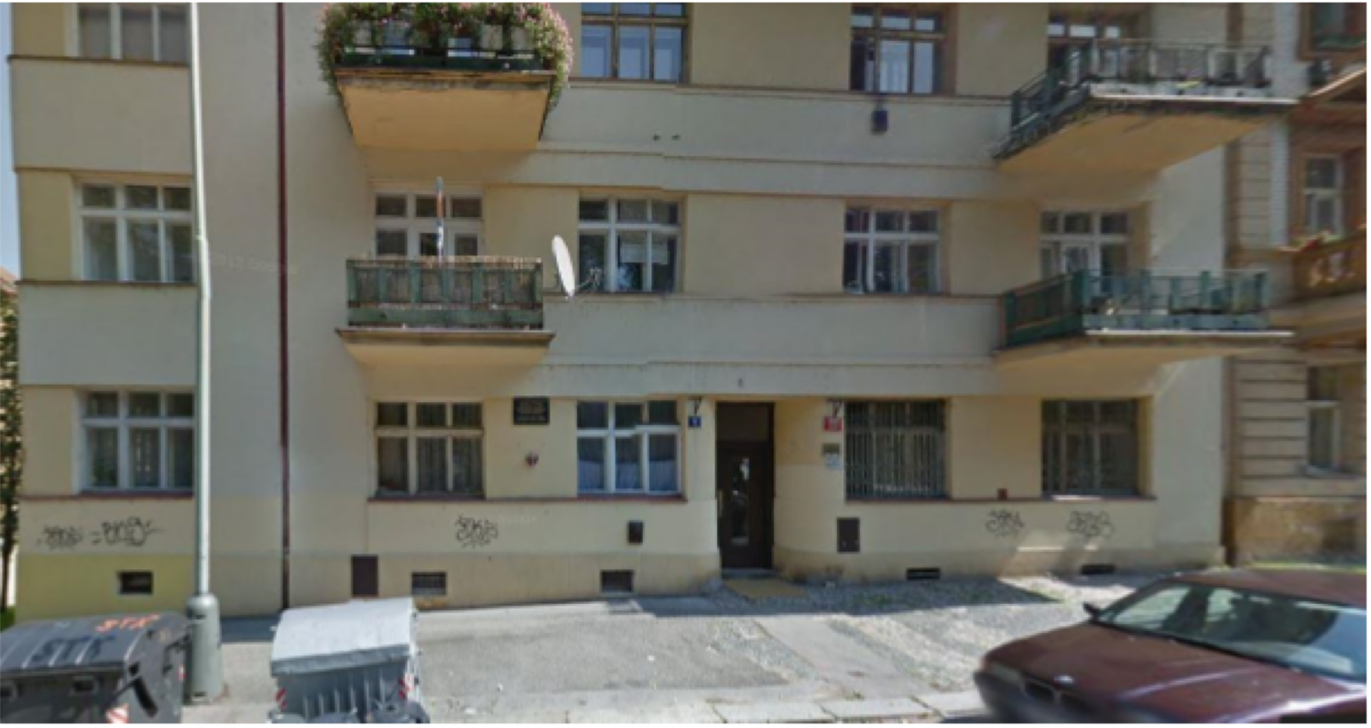 Adresse : Kovaku 12, Prague 5 (une maison, à l’angle jaune, après les larges escaliers extérieurs)
