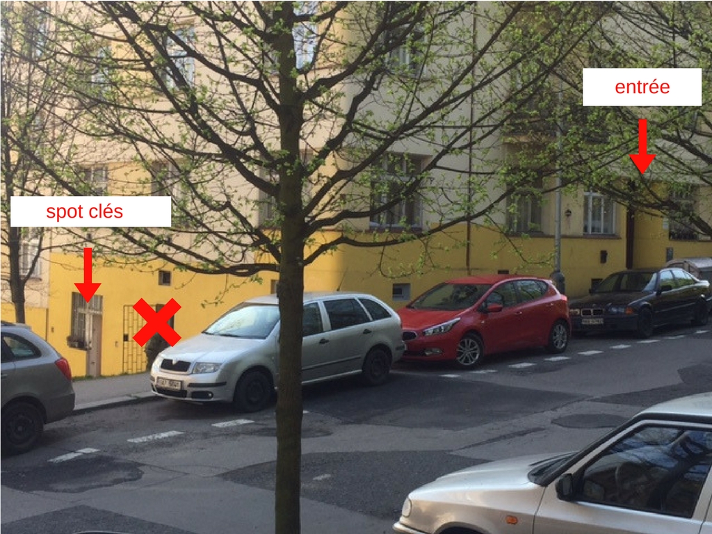Sur le côté du bâtiment, vous pouvez voir un escalier reliant deux rues. La rue du bas est la rue Radlicka et celle du haut est la rue Kovaku. L'entrée se trouve sur la partie jaune du bâtiment porte du milieu avec une grille métallique.