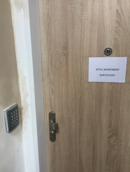 Ouvrir la porte de l'appartement en utilisant le dernier CODE (troisième) reçu par courrier électronique ou SMS (nous envoyons ceux-ci séparément).