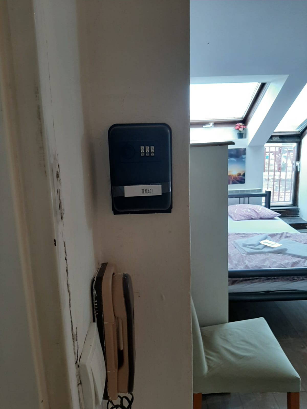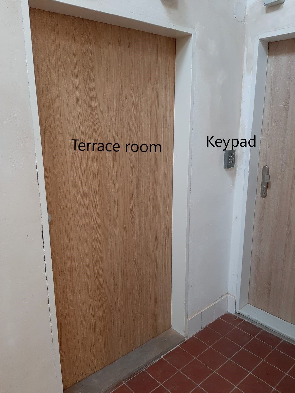 Use the code for keypad, we have sent in separate email to open Terrace room on your left. Inside the room, there is a keybox, that you can open with last code and use the key to lock the dorr for security reasons.