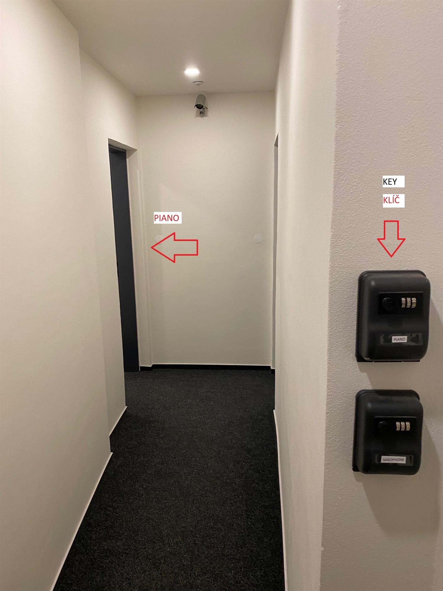 Opposite of the mailboxes you see entry door to Piano, Saxophone and Guitar room via second keypad